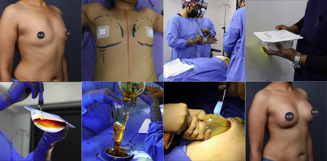 The patient underwent hybrid breast augmentation for bilateral hypomastia, involving the placement of 315 CC Silimed silicone implants in both breasts, complemented by autologous fat grafting for enhanced contour and volume.